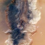 An overview of the Hebes Chasma, an enclosed, almost 8km-deep trough stretching 315km in an east–west direction and 125km from north to south at its widest point. It sits about 300km north of the vast Valles Marineris canyon.