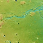 This image shows a region of the planet’s northern hemisphere known as Hephaestus Fossae. The image has been colored to indicate the elevation of the terrain: green and yellow shades represent shallow ground, while blue and purple stand for deep depressions, down to about 4km. Scattered across the scene are a few dozen impact craters that cover a wide range of sizes, with the largest boasting a diameter of around 20km. It has overprinted on a long and intricate channel network indicative of the Red Planet’s watery past.