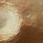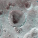 View of an unnamed crater in the northern latitudes of Mars. The crater is 35km wide and has a maximum depth of approximately 2km beneath the crater rim. The circular patch of bright material located at the centre of the crater is residual water ice.