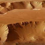 A view of the stunning central mesa inside Hebes Chasma. A horseshoe-shaped chunk has been taken out of one side of the mound (left in this image); the material has slumped down onto the floor of the valley below. A dark patch appears to pool like spilt ink across the debris. It is most likely loose material that has slid down the walls from an intermediate layer. Melted ice could have played a role by weakening the rocks to create its flow-like appearance.