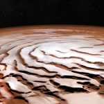 Perspective view of the Mars north polar ice cap and its distinctive dark troughs forming a spiral-like pattern.