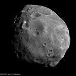 A close-up image of the Martian moon Phobos.