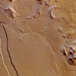 A natural-color view of Reull Vallis. The river-like channel is believed to have been formed by flowing water, which at some distant epoch cut through highland terrain and successively formed smooth plains. With a width of close to 7km and a depth of around 300m, the valley floor shows clear linear features believed to be ice-rich and formed by debris and ice in a manner not dissimilar to the formation of glacial valleys on Earth.