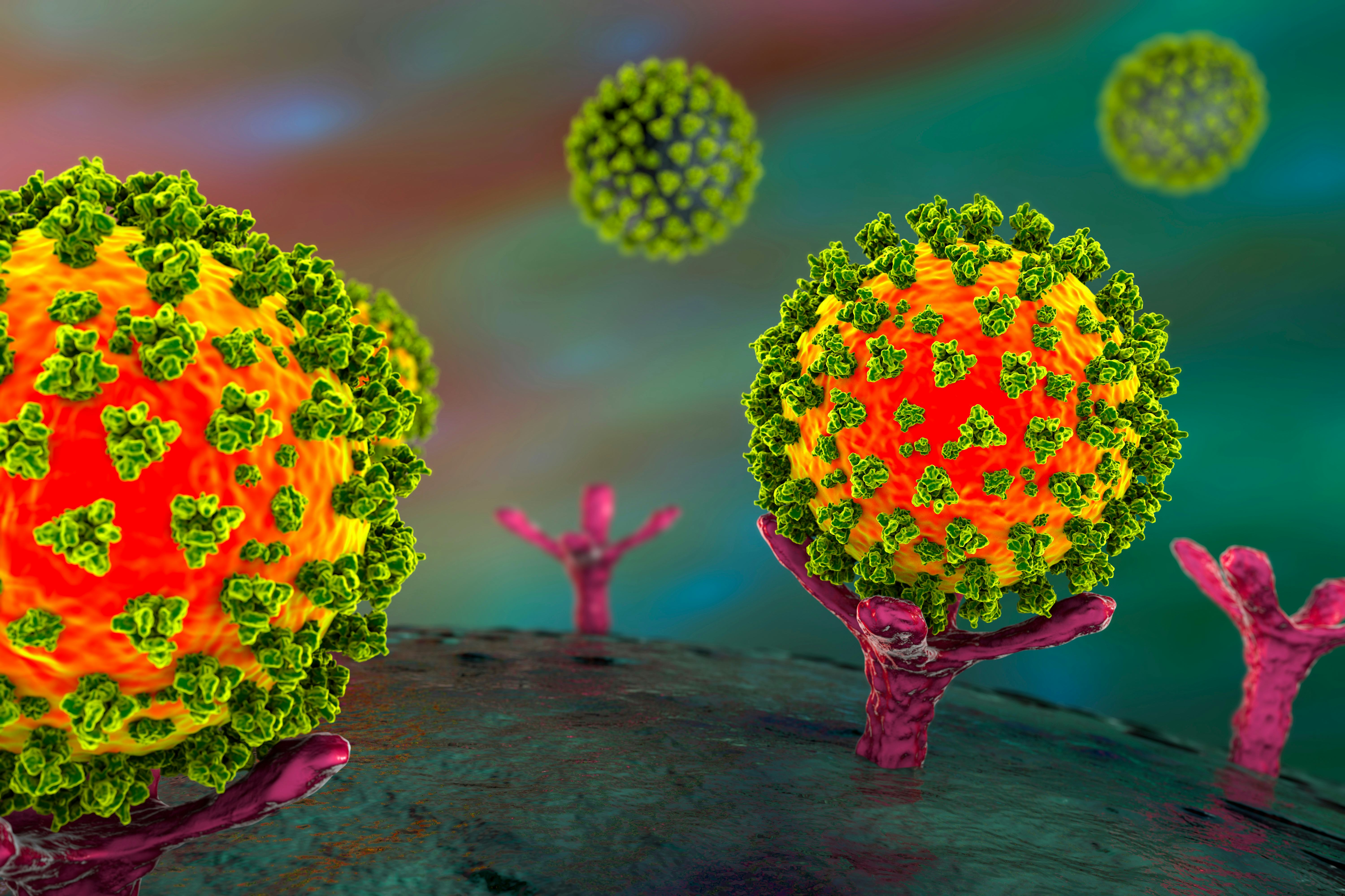 Illustration of the initial stage of Covid-19 infection: SARS-CoV-2 virus particles binding to specific receptors on the surface of cells. Shutterstock